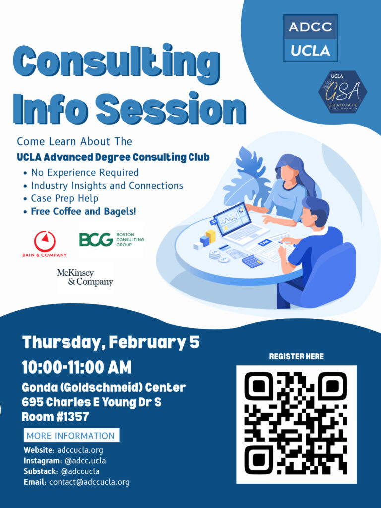 The Advanced Degree Consulting Club (ADCC) at UCLA is hosting a Consulting Info session on February 5 10-11AM at Gonda 1357. Come learn about careers in consulting and the resources that ADCC provide to help advanced degrees transition careers. Free coffee and bagels while supplies last! RSVP required.