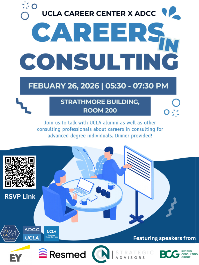 Join us for Career Roundtables: Careers in Consulting, co-hosted by UCLA ADCC and the Career Center on February 26 from 5:30-7:30pm at Strathmore Building Room 200 (501 Westwood Plaza). Come meet UCLA alumni and industry professionals for a deep dive into the industry. Build your professional relationships and learn more about the field! Dinner provided. RSVP required.